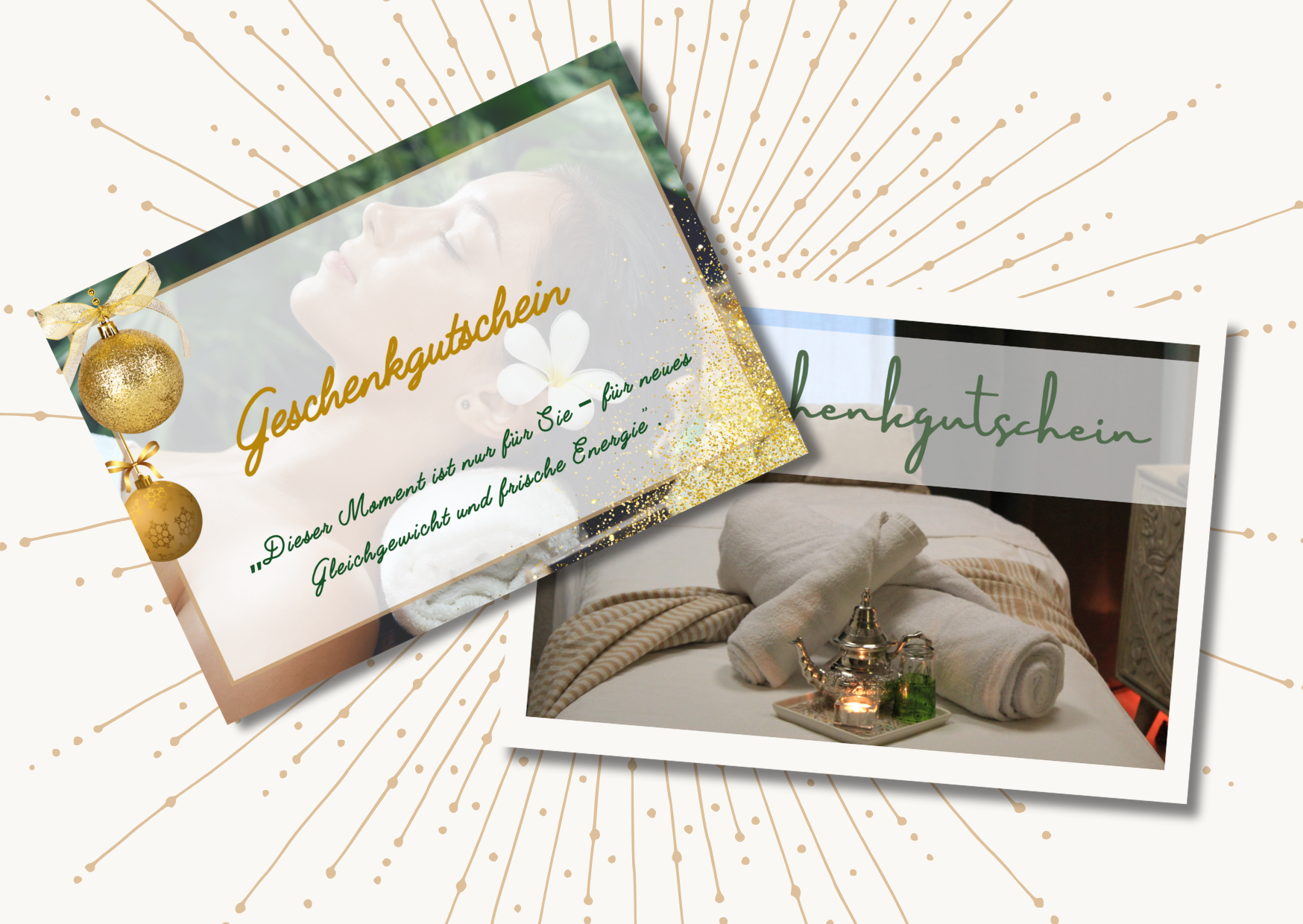 Unsere Geschenk-Gutscheine sind das perfekte Präsent für jeden Anlass – sei es zum Geburtstag, zu Feiertagen oder einfach nur, um jemandem eine Freude zu bereiten. Lassen Sie Ihre Freunde und Familie in die Welt der Entspannung eintauchen und genießen Sie die wohltuenden Massagen, die Körper und Geist revitalisieren. Schenken Sie nicht nur einen Gutschein, sondern ein unvergessliches Erlebnis voller Ruhe und Harmonie. Besuchen Sie uns und machen Sie das Wohlfühlen zum Geschenk!